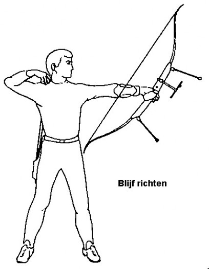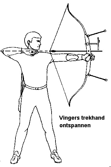 Ontspan ook de booghand. Laat de boog als het ware uit je handen vallen alsof je een 'sling' om hebt
