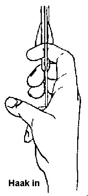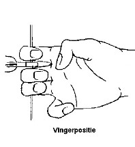 De pees wordt vastgehouden met de wijsvinger boven de nok en midden- en ringvinger eronder